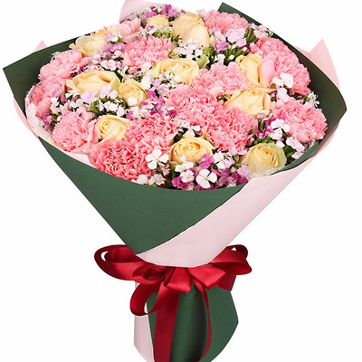 19支粉色康乃馨,12朵香槟玫瑰,搭配适量粉色石竹梅、黄莺