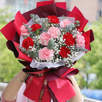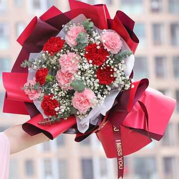 5朵红康6朵粉康,白色满天星间插,尤加利点缀