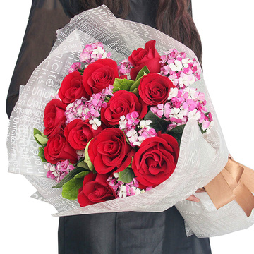 11朵红玫瑰,粉色石竹梅丰满间插,栀子叶搭配