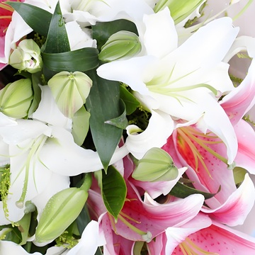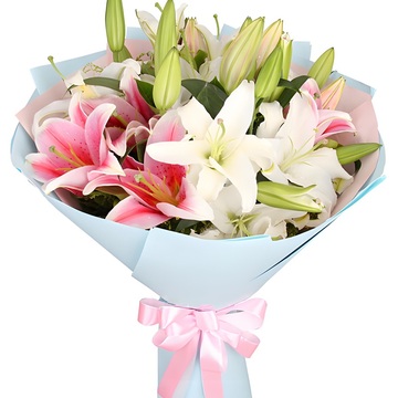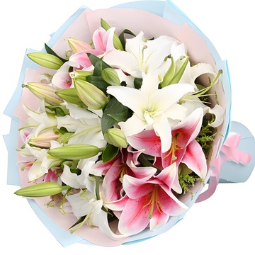 21朵白粉百合混搭,黄莺、栀子叶搭配。