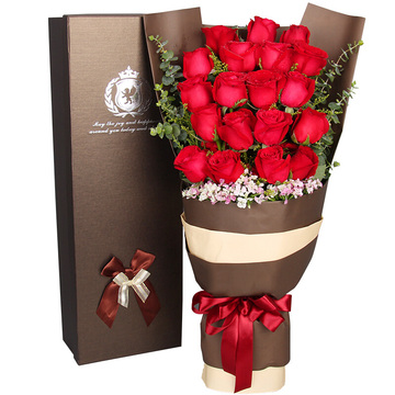咖啡色及米白色牛皮纸扇形包装,红色缎带束扎。礼盒装花语:青春是美好的,不管是现在,还是暮年,你就是我的热血青春!附送: