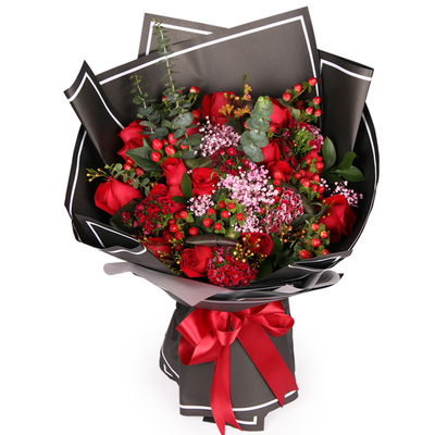 19支精品红玫瑰,搭配适量红色石竹梅、红豆、粉色满天星、尤加利。