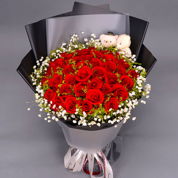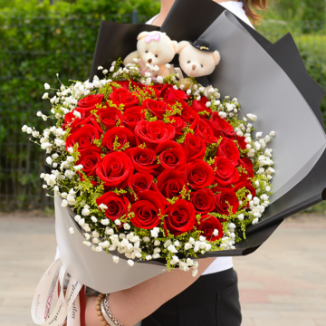 33朵红玫瑰,满天星丰满围边,黄莺间插,一对可爱小熊