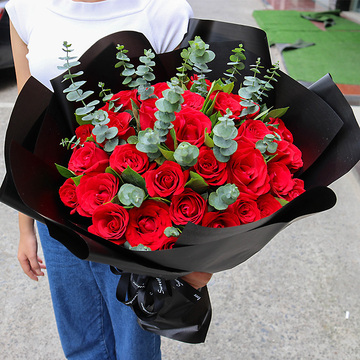 33朵红玫瑰,尤加利丰满间插,栀子叶点缀