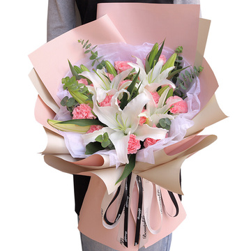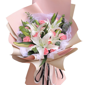 19朵粉色康乃馨,3枝多头白百合,尤加利间插
