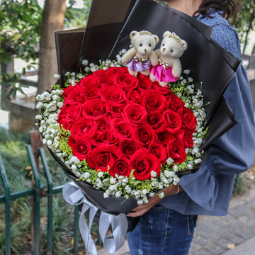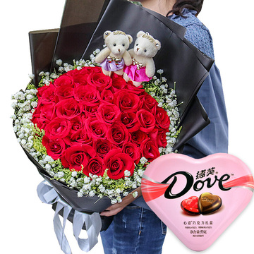 33朵精品红玫瑰,白色满天星、黄莺丰满围边,两只可爱小熊。一盒德芙53g心形巧克力(口味随机)。