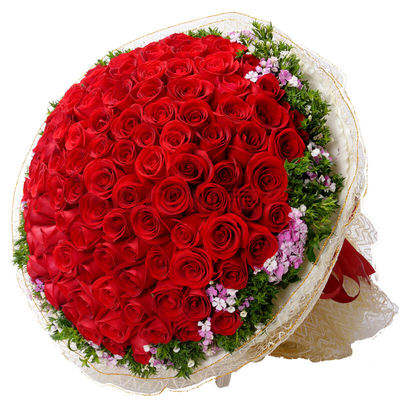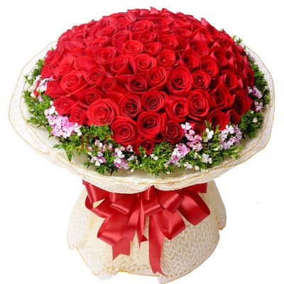 精选99朵红玫瑰花束,搭配粉色相思梅。