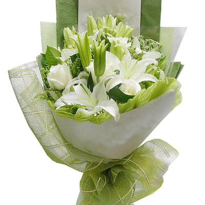 白色,绿色包装纸外围,绿色纱网扇形包装,绿色缎带扎束。花语:把问候放在枕边,醒来你能看见;把阳光引进房间,生活没有阴暗;把热情注入心田,身心不再疲倦;把幸福留在身边,你的笑容灿烂。灿烂鲜花,穿街走巷,带着我最深的祝福,直达你心上。附送: