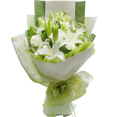 4枝多头香水百合,2朵白玫瑰黄莺装饰。
