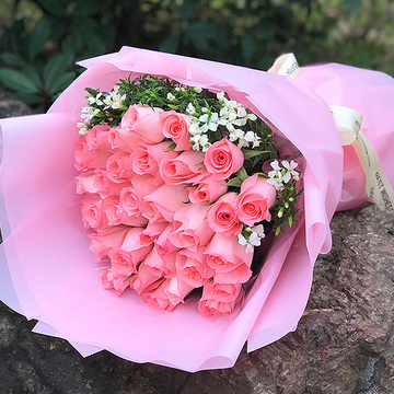 33朵戴安娜粉玫瑰,白色相思梅搭配