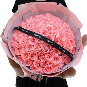 99朵戴安娜粉玫瑰,黑色英文缎带搭配