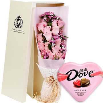 19朵戴安娜粉玫瑰,粉色相思梅丰满间插搭配。一盒德芙53g心形巧克力(口味随机)