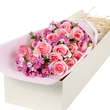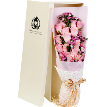 花束用粉色雾面纸扇形包装,白色落水纸束腰,拉菲草扎束,精美礼盒包装。花语:等待,只为与你的相遇。也许没有人会相信,这一刹那迸出的光芒,将要映亮你我漫漫一生。附送: