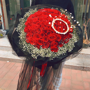 99朵红玫瑰,白色满天星丰满,一个皇冠,黑纱