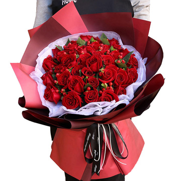 33朵红玫瑰,红豆丰满间插,绿叶点缀