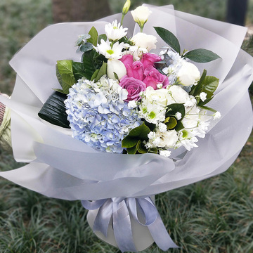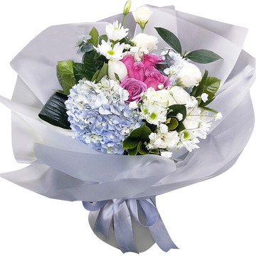 5朵冷美人5朵白玫瑰1朵蓝绣球,1枝白桔梗,适量白色雏菊,栀子叶间插,巴西叶搭配,白色满天星点缀