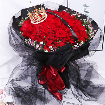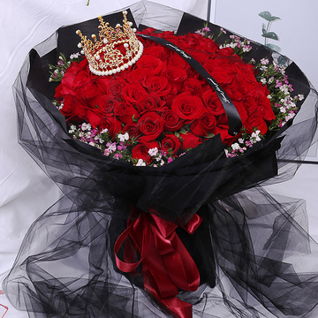 99朵精品红玫瑰,粉色相思梅丰满围边,搭配皇冠、黑色英文缎带装饰