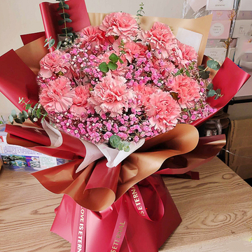 19朵粉康乃馨,粉色满天星丰满搭配,尤加利间插