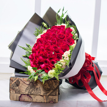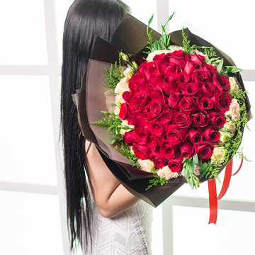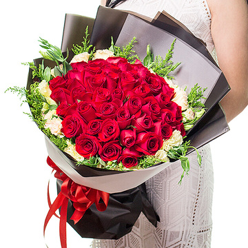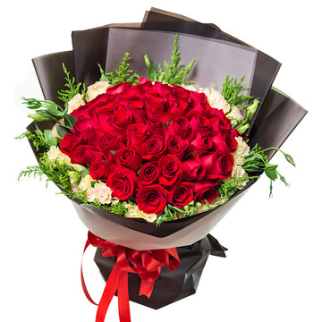内衬白色雾面纸,黑色雾面纸双层扇形包装,白色雾面纸束腰,红色缎带束扎花语:幸福就是,陪你走一条叫一辈子的路,也许会累,会疲惫,却从没想过放弃因为,我是如此爱你!附送: