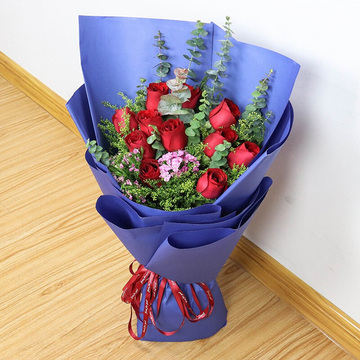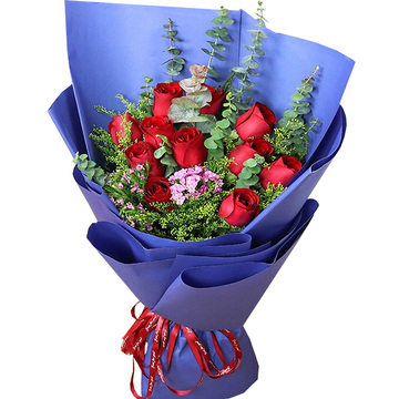蓝色牛皮纸扇形包装,红色英文丝带束扎花语:傻小子的爱,简单,干净,澄澈!呆呆的带着一股子韧劲儿!傻傻的愿意为你付出所有!附送: