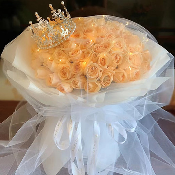 99枝香槟玫瑰,皇冠、灯带、白纱盖头