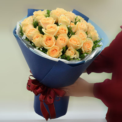 33朵香槟玫瑰,白色小花间插(随机赠送两只可爱小公仔)
