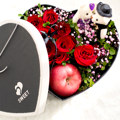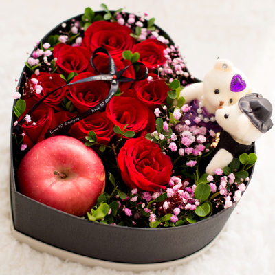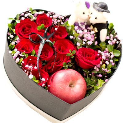 11朵红玫瑰,1个苹果,2只可爱小熊,满天星、绿叶装饰。