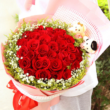 33朵优质红玫瑰,黄莺、满天星点缀,可爱小熊一对。