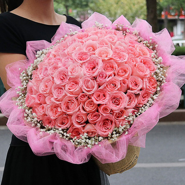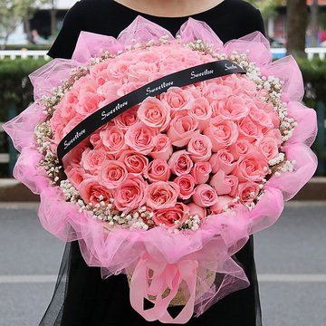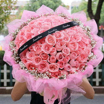 99支戴安娜粉玫瑰,白色满天星丰满围边。黑色英文缎带装饰。
