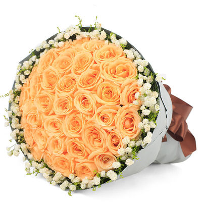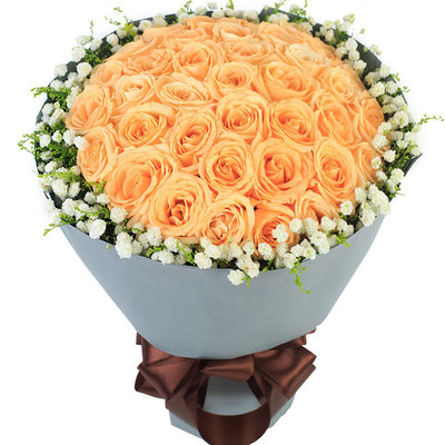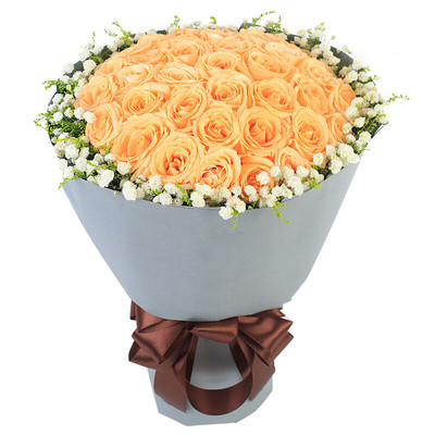 灰色厚牛皮纸圆形包装,搭配精美咖啡色缎带蝴蝶结束扎。花语:你是我期待又矛盾的梦,想抓住又不能拥抱的风。附送: