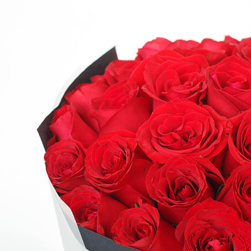 内衬黑色硬边纸,外层白色雾面纸圆形包装,红色缎带束扎。花语:愿情人节带给我们丘比特之爱和暖融融的浪漫,情人节快乐!附送: