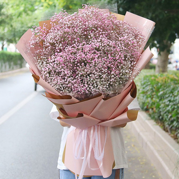 内衬玻璃纸,外层粉色欧雅纸层次扇形包装,粉色+白蕾丝缎带束扎花语:轻轻拨开轻纱,揭开魂牵梦萦的芳华。我许下最美的愿望,愿你幸福安康附送: