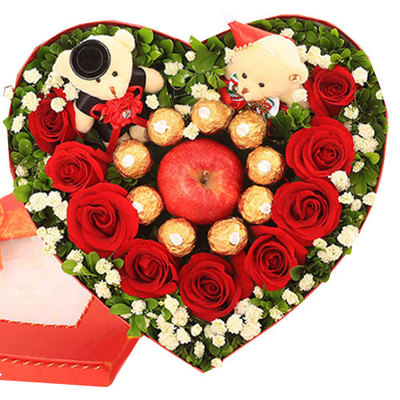 9朵红玫瑰+9颗费列罗巧克力+情侣小熊一对+苹果一个,米兰叶、满天星丰满点缀。