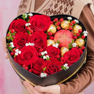 9朵红玫瑰,1个苹果,5颗巧克力,红豆、相思梅搭配
