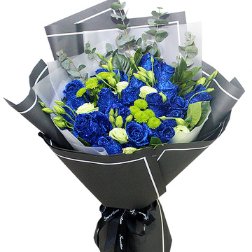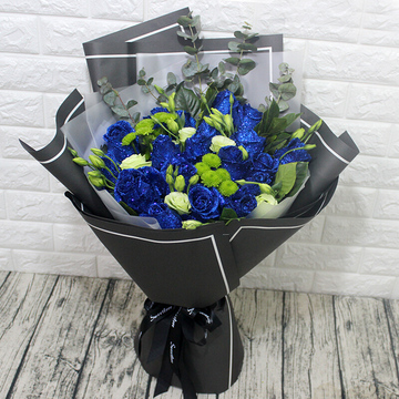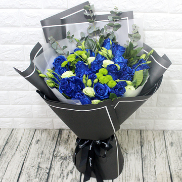 19朵蓝色妖姬,搭配尤加利叶、桔梗、小雏菊。