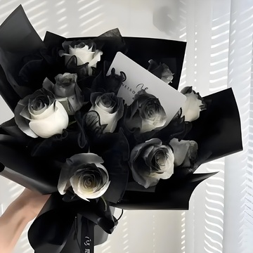 黑色包装花语:由于鲜花包扎各地的花艺师不同,可能在花束的形式和搭配上与图片不完全一致,但我们保证鲜花的主花材品种、新鲜程度、数量、颜色与说明一致,谢谢。附送: