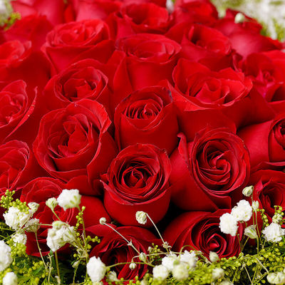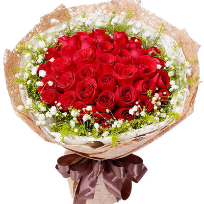 33支精品红玫瑰,外围搭配适量白色满天星、黄莺。