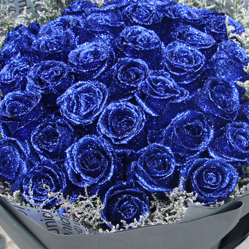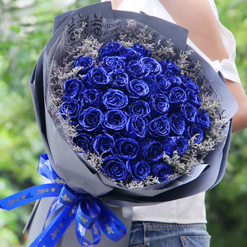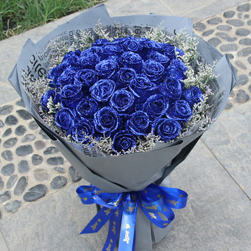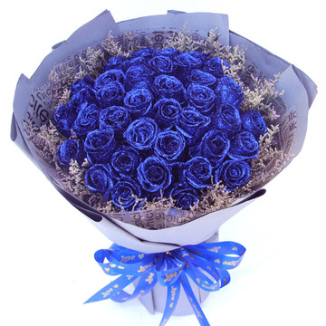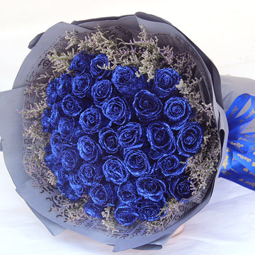 精选33朵蓝玫瑰,情人草搭配。