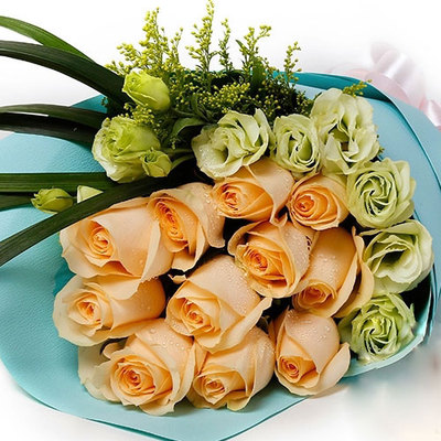 11枝香槟玫瑰,搭配桔梗,黄莺,丝带草