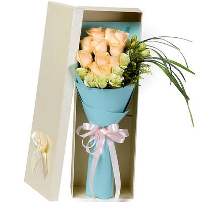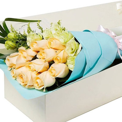 浅蓝色艺术纸,手握处系粉色丝带,米白色礼盒花语:如今的时代,爱情在电波里穿越千山万水,在思念里直抒情怀,可于刹那传递给心爱的人。我要把爱写在贺卡里,放飞在电波中,传递到你的心上,伴你美丽到永远。亲爱的,我爱你。附送: