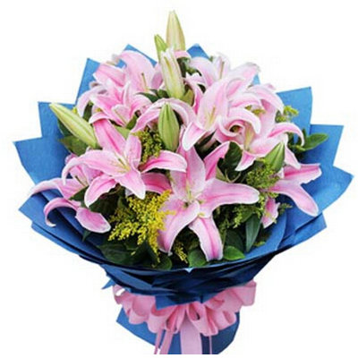 多层蓝色包装纸,粉色蝴蝶结束扎花语:重燃青春绚丽的花为,谱一曲恋歌,让心中的百合绽放如风雨后附送: