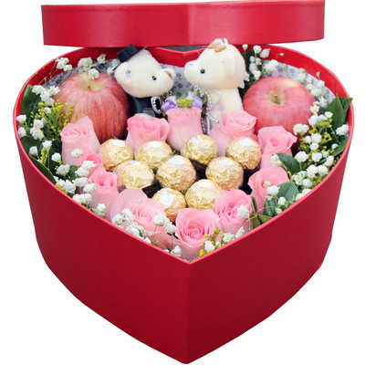 11朵戴安娜粉玫瑰,9颗费列罗巧克力,2个苹果,2只小熊