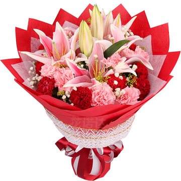 19枝康乃馨(红色和粉色混搭),2枝粉色多头百合,满天星黄莺点缀