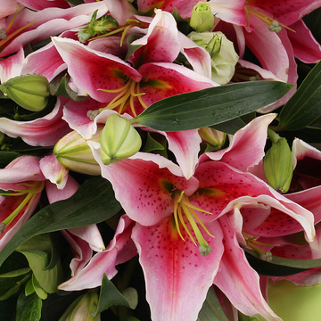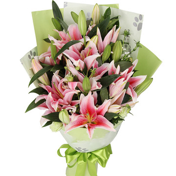 26朵粉色香水百合,栀子叶+相思梅+桔梗丰满搭配。