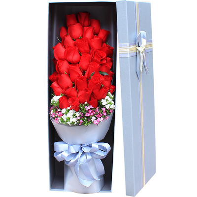 白色雾面纸包装,淡蓝色缎带束扎,精致礼盒包装。花语:我想你的时候最缠绵,无论我们相聚多远,前面的路有多坎坷,只想说:你是我今生最大的幸福。附送: