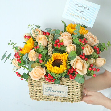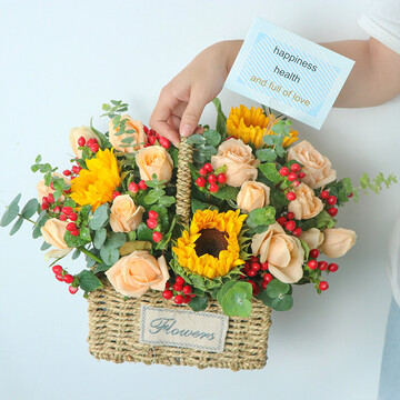 精美花篮包装花语:不知道为什么,你的身上总是洒满了阳光,你的笑很温暖,你的一切都很好看!附送: