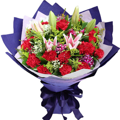 19支红色康乃馨+2支粉色多头百合,搭配黄莺、石竹梅、满天星、栀子叶