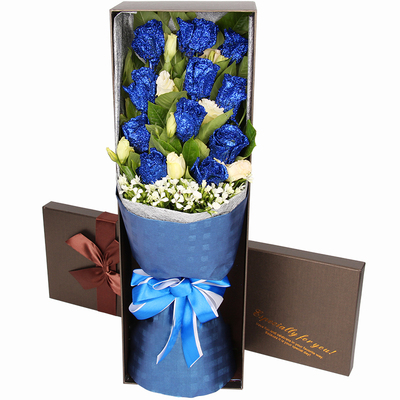 11支精品蓝色妖姬,搭配适量白色洋桔梗、栀子叶、白色相思梅