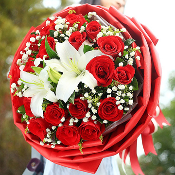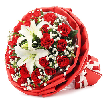 21朵红玫瑰搭配2枝多头白百合,白色满天星点缀,黄莺间插