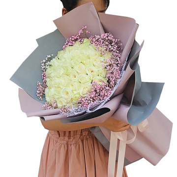 33朵白玫瑰,粉色满天星丰满围边